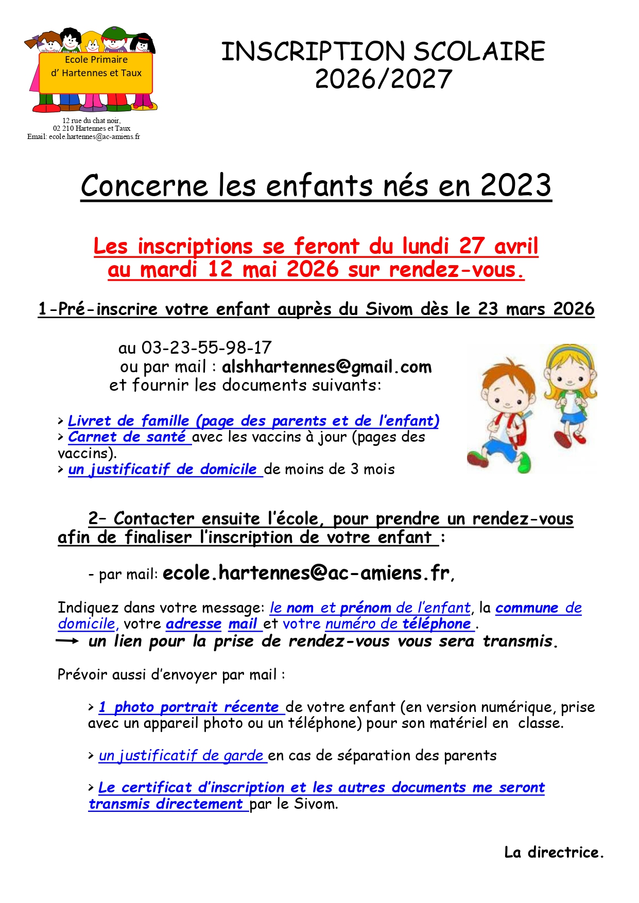 | Pour la rentrée scolaire 2020/2021, le village compte 11 enfants allant à l'école maternelle et primaire d'Hartennes et Taux. |
